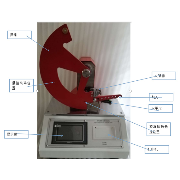 擺錘:產(chǎn)生撕裂力矩,撕裂試樣; 夾紙器:用于夾持、固定試樣; 切刀:在試樣上切出撕裂口; 顯示屏:點(diǎn)陣式液晶顯示屏,系統(tǒng)操作界面; 打印機(jī):微型高速熱敏打印機(jī); 按鍵面板:用戶對(duì)儀器進(jìn)行操作的面板; 安裝腳:四個(gè)安裝腳,可調(diào)節(jié)儀器安放的水平性和穩(wěn)定性