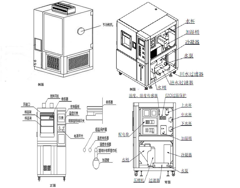 即試驗箱體、制冷系統、空氣調節系統、電器控制柜、制冷機組為一整體,制冷機組位于箱體底部,電器控制部份置于試驗箱的側面,便于操作